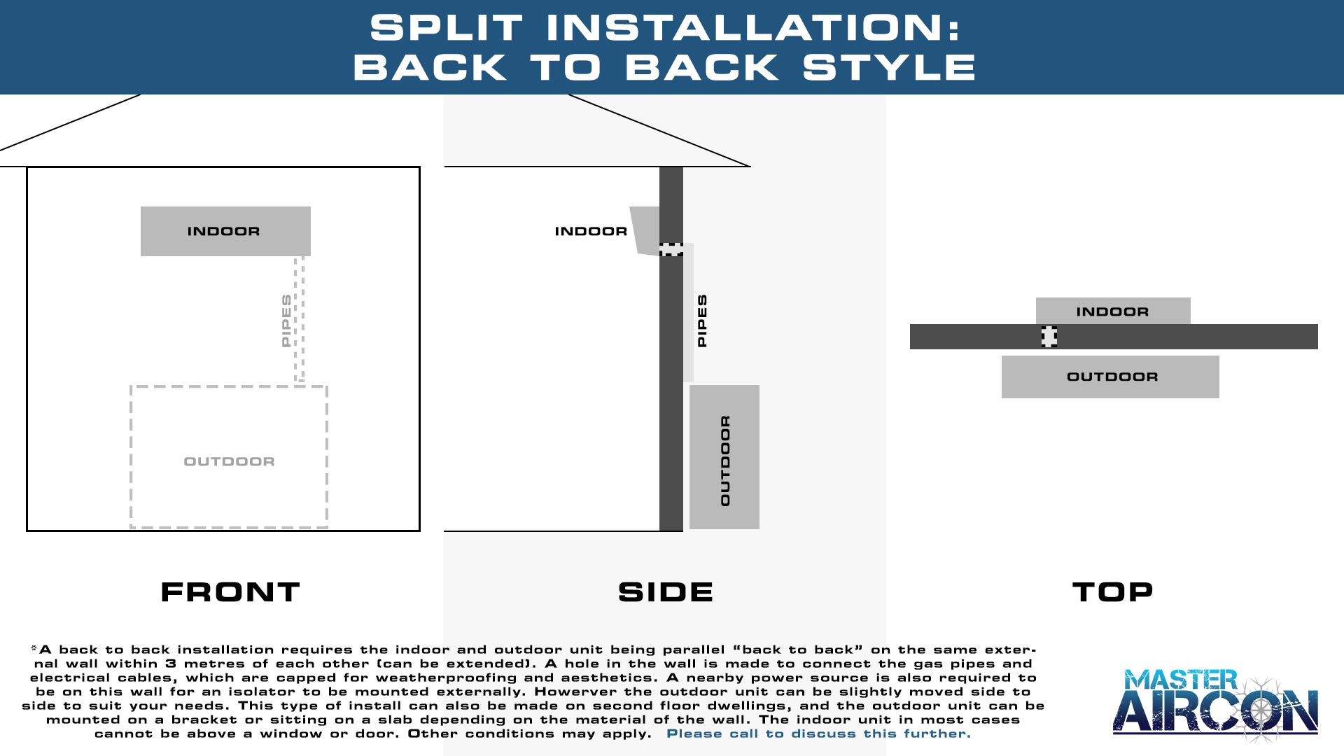 *A typical back to back installation requires the indoor and outdoor unit being parallel “back to back” on the same external wall within 3 metres of each other (can be extended). A hole in the wall is made to connect the gas pipes and electrical cables, which are capped for weatherproofing and aesthetics. A nearby power source is also required to be on this wall for an isolator to be mounted externally.